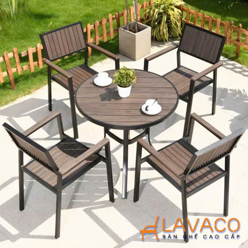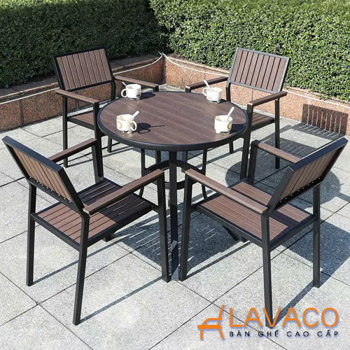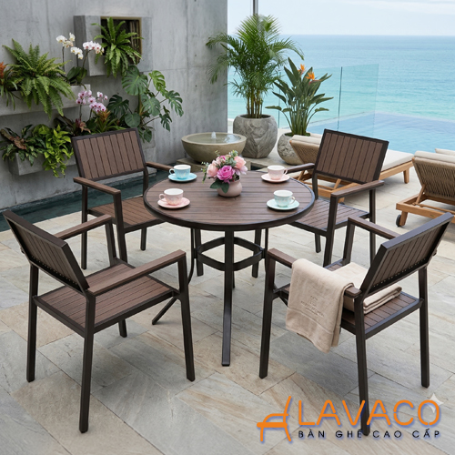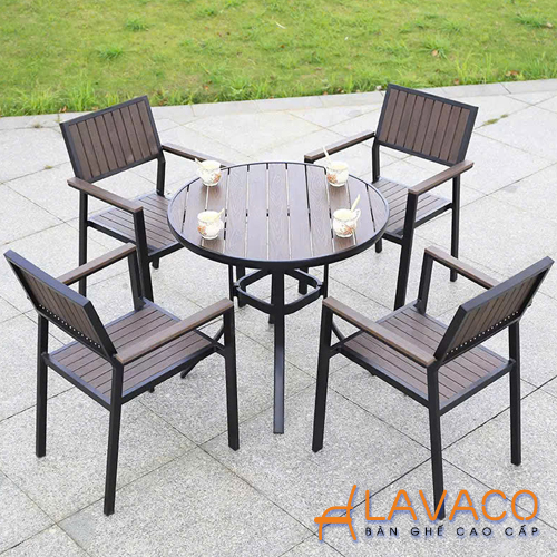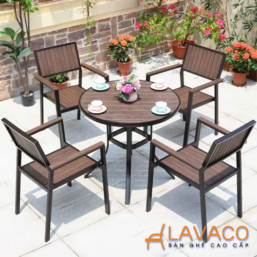 - Khung bàn và ghế được làm từ nhôm sơn tĩnh điện cao cấp, giúp chống oxy hóa, không han gỉ khi sử dụng ngoài trời. Phần mặt bàn và ghế sử dụng nan nhựa composite giả gỗ, tái hiện vẻ đẹp tự nhiên của gỗ thật với màu sắc ấm áp, sang trọng nhưng lại vượt trội về độ bền.
