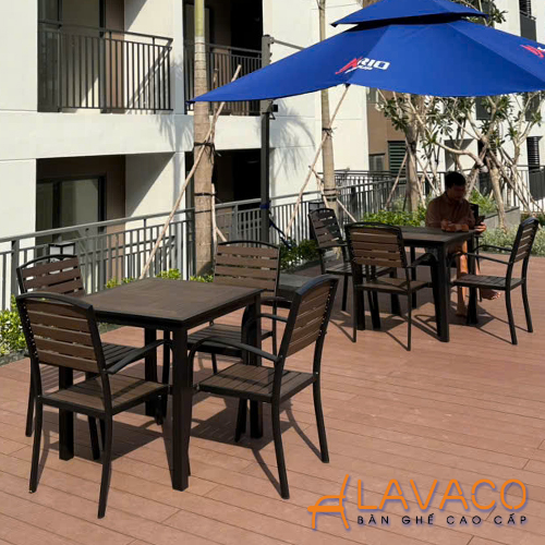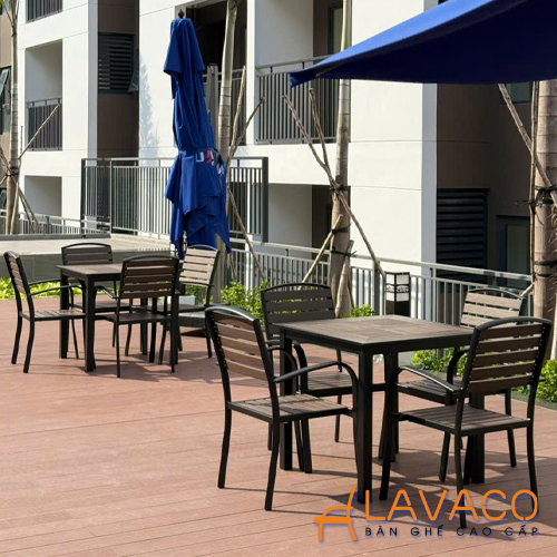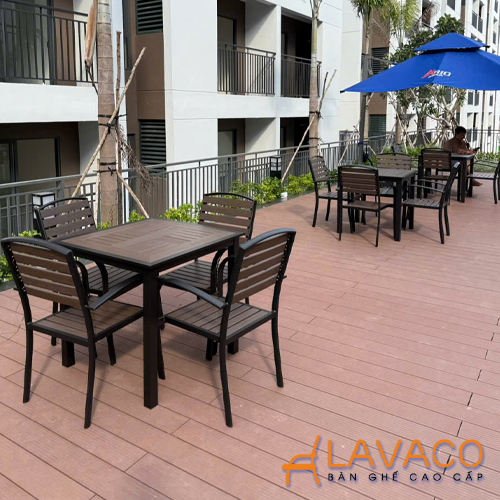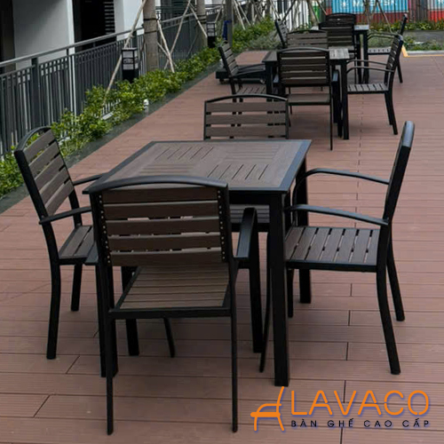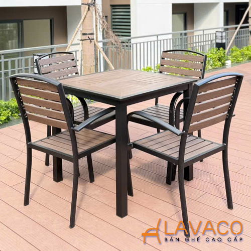 • Vật liệu: Bàn khung nhôm sơn tĩnh điện, mặt bàn nan nhựa composite giả gỗ (gỗ Polywood). Khung nhôm đúc sơn tĩnh điện, yên ngồi, tựa lưng nan gỗ nhựa composite (Polywood).