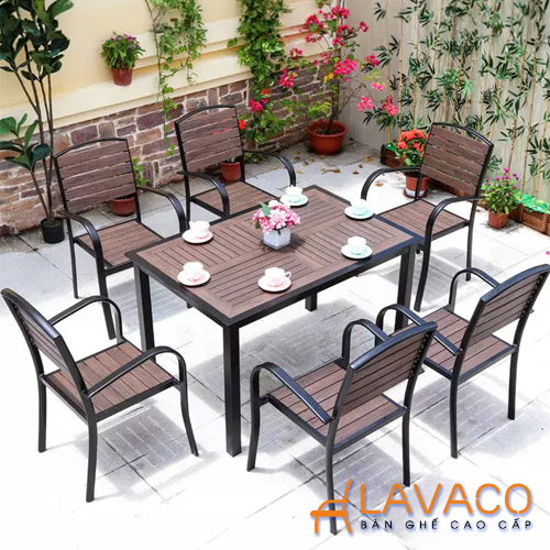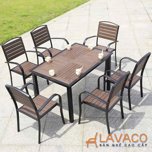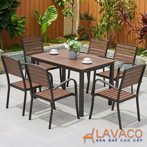 - Khung bàn và ghế được làm từ nhôm sơn tĩnh điện cao cấp, có khả năng chống oxy hóa, không han gỉ khi sử dụng ngoài trời. Phần mặt bàn và ghế sử dụng nan nhựa composite giả gỗ, mang đến vẻ đẹp tự nhiên, sang trọng như gỗ thật nhưng bền bỉ hơn rất nhiều.