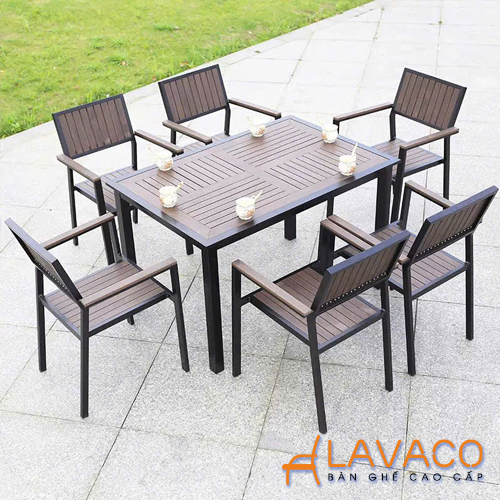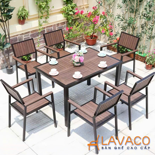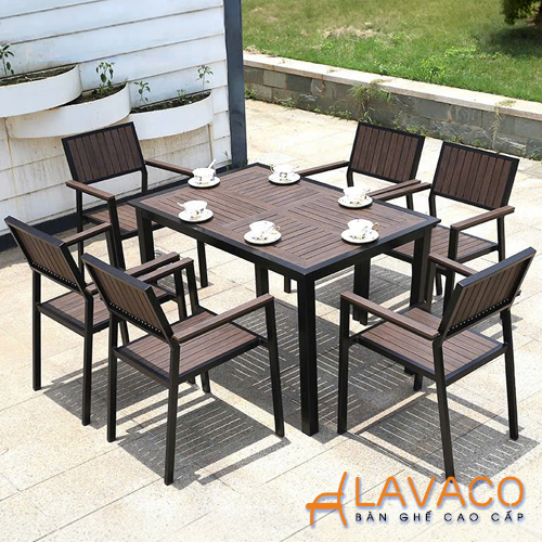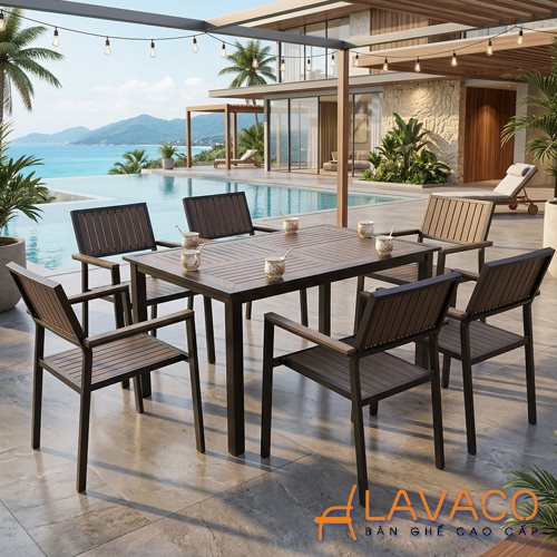 - Khung bàn và ghế được làm từ nhôm sơn tĩnh điện cao cấp, giúp chống oxy hóa, không han gỉ khi sử dụng ngoài trời. Phần mặt bàn và ghế sử dụng nan nhựa composite giả gỗ, mang lại vẻ đẹp tự nhiên, sang trọng như gỗ thật nhưng bền bỉ hơn rất nhiều, không cong vênh, không mối mọt.
