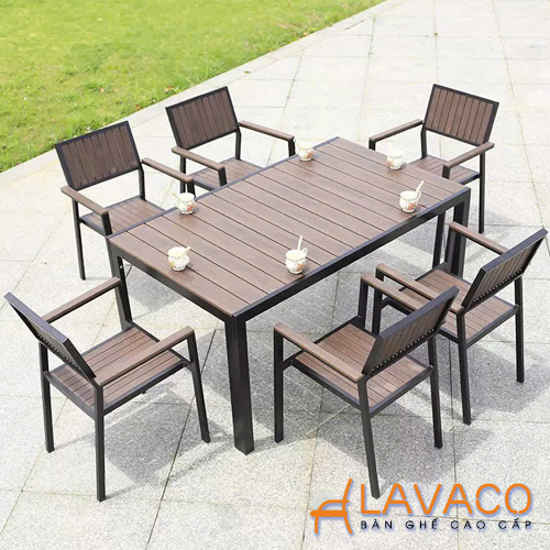 • Vật liệu: Bàn khung nhôm sơn tĩnh điện, mặt bàn nan nhựa composite giả gỗ (gỗ Polywood). Khung nhôm đúc sơn tĩnh điện, yên ngồi, tựa lưng nan gỗ nhựa composite (Polywood).
