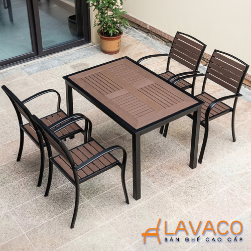 • Vật liệu: Bàn khung nhôm sơn tĩnh điện, mặt bàn nan nhựa composite giả gỗ (gỗ Polywood). Khung nhôm đúc sơn tĩnh điện, yên ngồi, tựa lưng nan gỗ nhựa composite (Polywood).