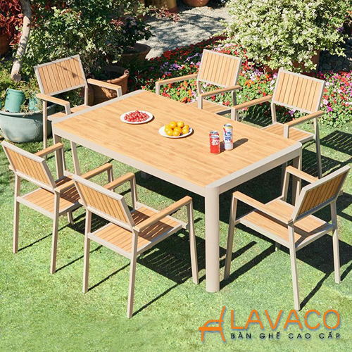 • Tên sản phẩm: Bộ bàn sân vườn khung nhôm nan gỗ nhựa.