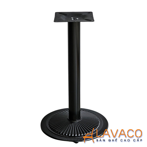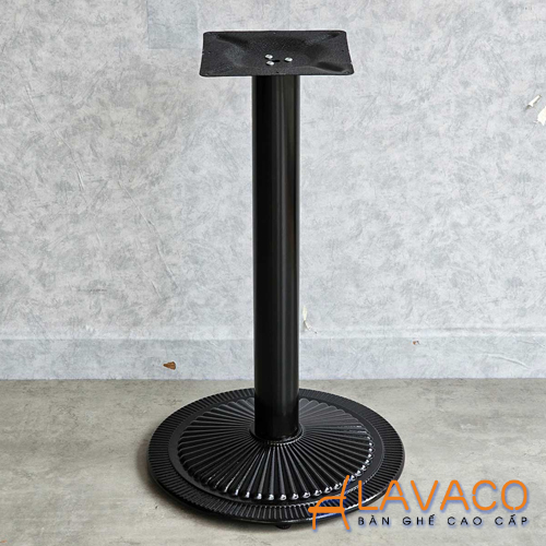 Chân bàn được thiết kế với đế mâm tròn đường kính 450mm, chế tạo từ gang đúc nguyên khối tạo nên sự vững chãi và chắc chắn tuyệt đối. Phần ống trụ trung tâm bằng thép sơn tĩnh điện vừa mang nét hiện đại, vừa chống trầy xước và chống gỉ hiệu quả. Tông màu đen nhám sang trọng giúp dễ dàng hòa hợp với mọi phong cách nội thất từ cổ điển đến hiện đại, đặc biệt là trong các quán cà phê, nhà hàng hay khu vực tiếp khách.